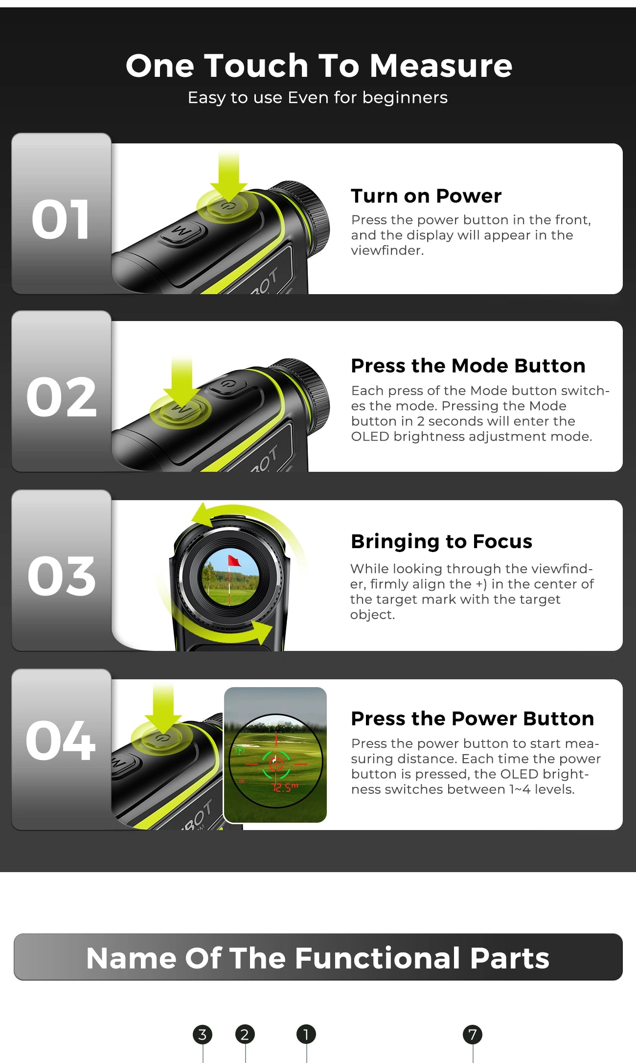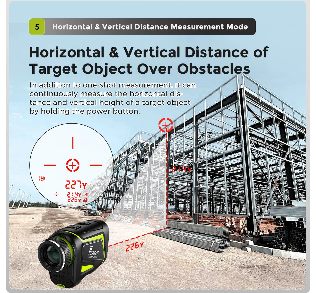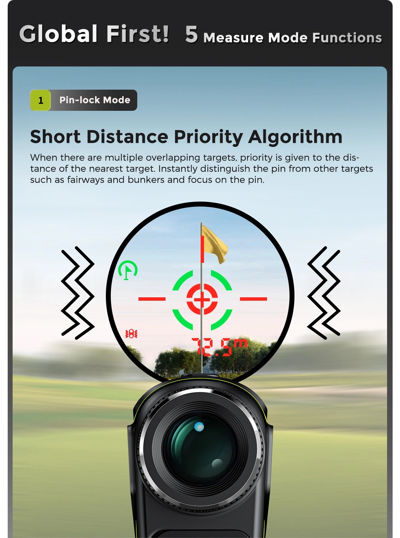 - 【5 Measurement Modes】A.Pin Mode; B. Slope Mode; C.Straight Line Distance Measurement Mode; D. Speed Measurement Mode; E. Horizontal and Vertical Distance Measurement Mode;
